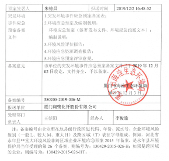 翔鷺化纖突發(fā)環(huán)境事件應(yīng)急預(yù)案備案表及備案批復(fù)